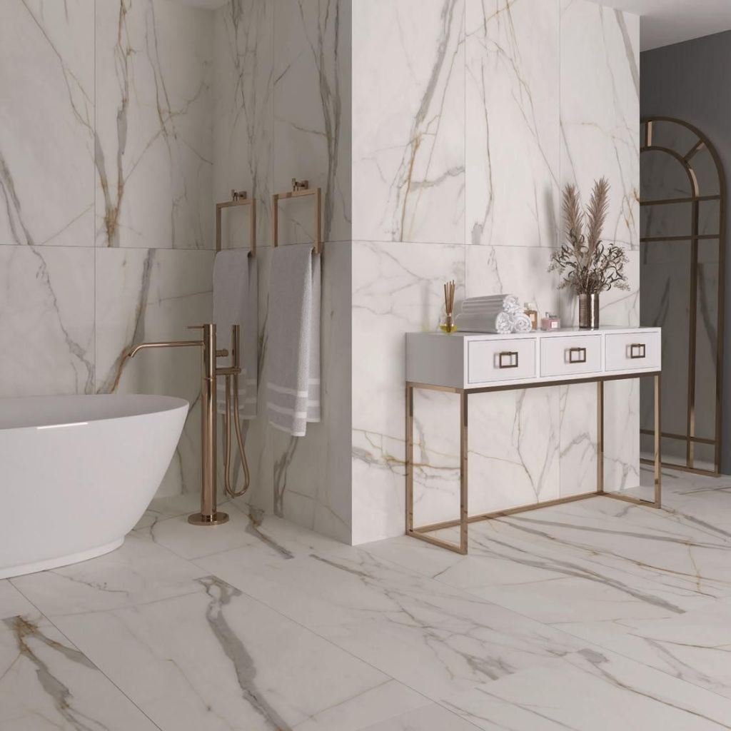 Die großflächigen Fliesen eignen sich sowohl für Wände als auch für Böden. Auf dem Foto ist zu erkennen, dass die schlichten Weißtöne perfekt mit den goldenen Accessoires harmonieren. Marble D’oro überzeugt durch seine ästhetische Erscheinung und seine Langlebigkeit, was es zu einer praktischen Wahl macht.